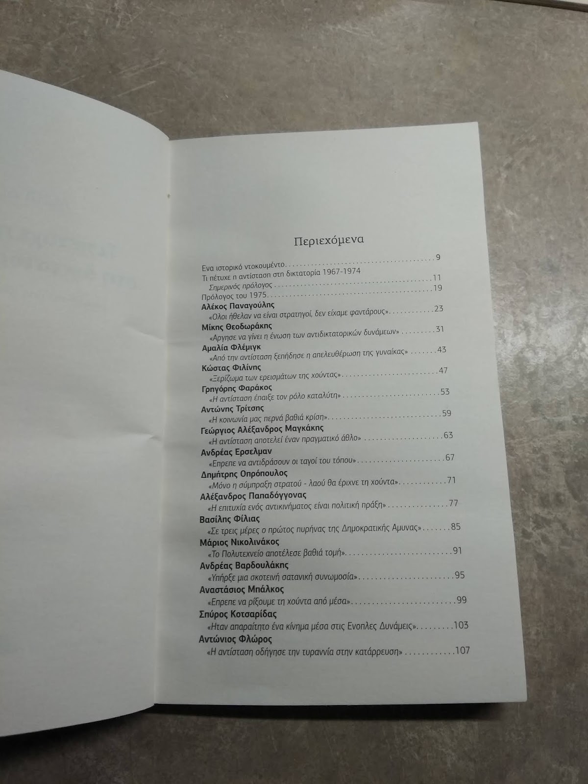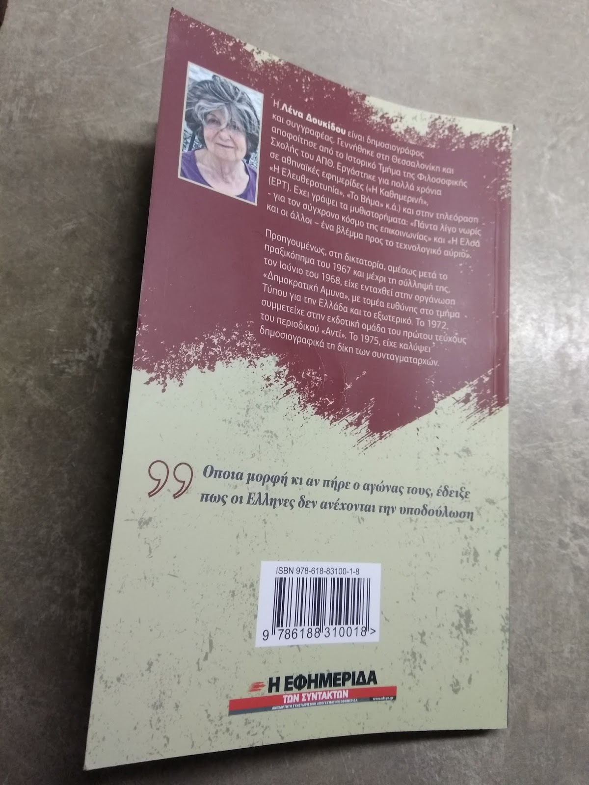Μέσα σε δυο μέρες κατόρθωσα να διαβάσω το βιβλίο της Λένας Δουκίδου το περασμένο Σαββατοκύριακο. Το βιβλίο αυτό βρέθηκε στα χέρια μου κάποια στιγμή μέσα από εφημερίδα. Με ενδιαφέρει εξαιρετικά οτιδήποτε έχει να κάνει με την περίοδο 1967-1974 και την πιο πρόσφατη αντιδικτατορική αντίσταση του ελληνικού λαού απέναντι στον φασισμό. Το παρόν βιβλίο αποτελείται από συνεντεύξεις που πήρε η συγγραφέας από μεγάλα στελέχη ( Αριστερά, Κεντρώα, Δεξιά) της αντίστασης κατά της δικτατορίας, λίγο μετά την πτώση της. Δικαίως αποτελεί ιστορικό ντοκουμέντο. Στις σελίδες του βιβλίου αυτού παρουσιάζεται η δημιουργία, δράση ή όχι των αντιδικτατορικών οργανώσεων και κινημάτων από την τραγική ημέρα της 21ης Απριλίου 1967 μέχρι και την πτώση της επτά χρόνια μετά. Εύκολα παρατηρεί κανείς τη δυσπιστία του ελληνικού λαού απέναντι στα αντιδικτατορικά κινήματα και οργανώσεις που δημιουργήθηκαν στους κόλπους του στρατού. Σε αυτό συνέβαλε και η προπαγάνδα του Παπαδόπουλου ότι είχε τον απόλυτο έλεγχο του στρατεύματος.